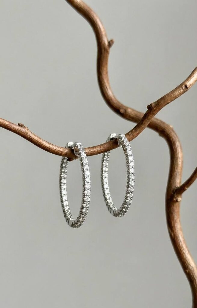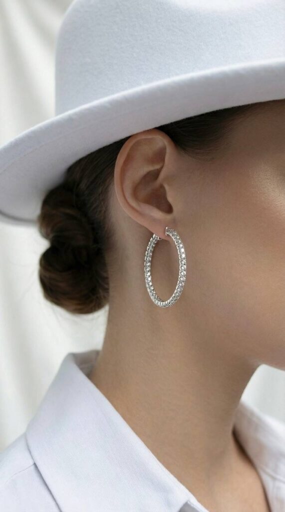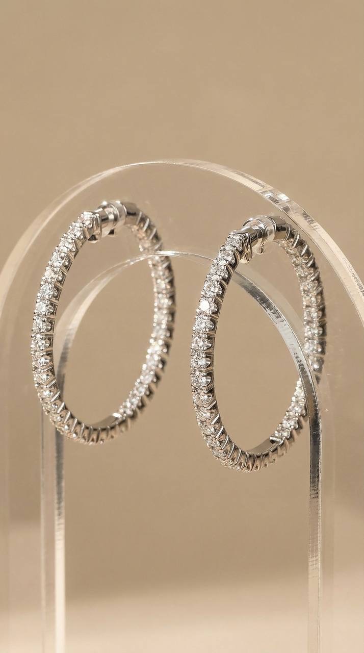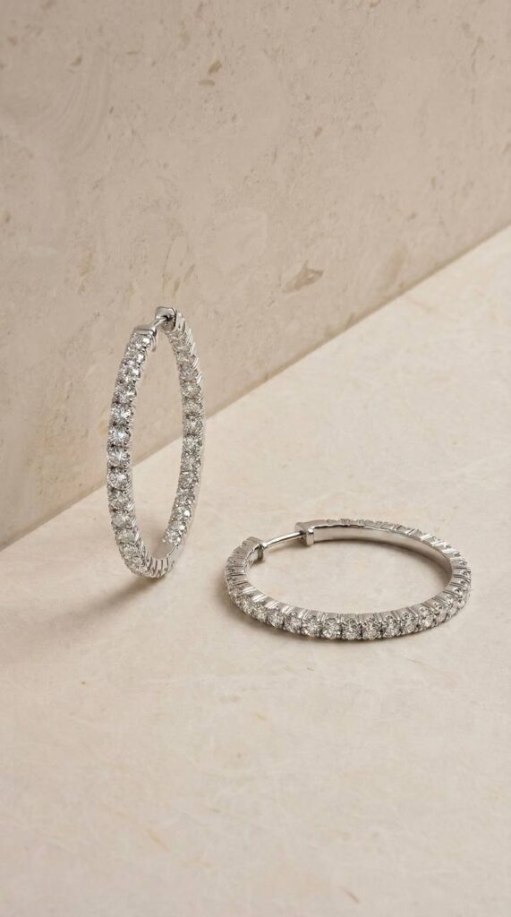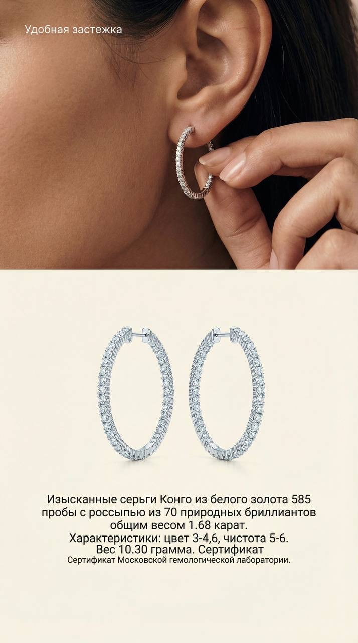 - Серьги Конго из белого золота с россыпью бриллиантов — элегантное украшение с выразительным сиянием и классическим дизайном. Подойдут как для повседневной носки, так и для особых случаев.