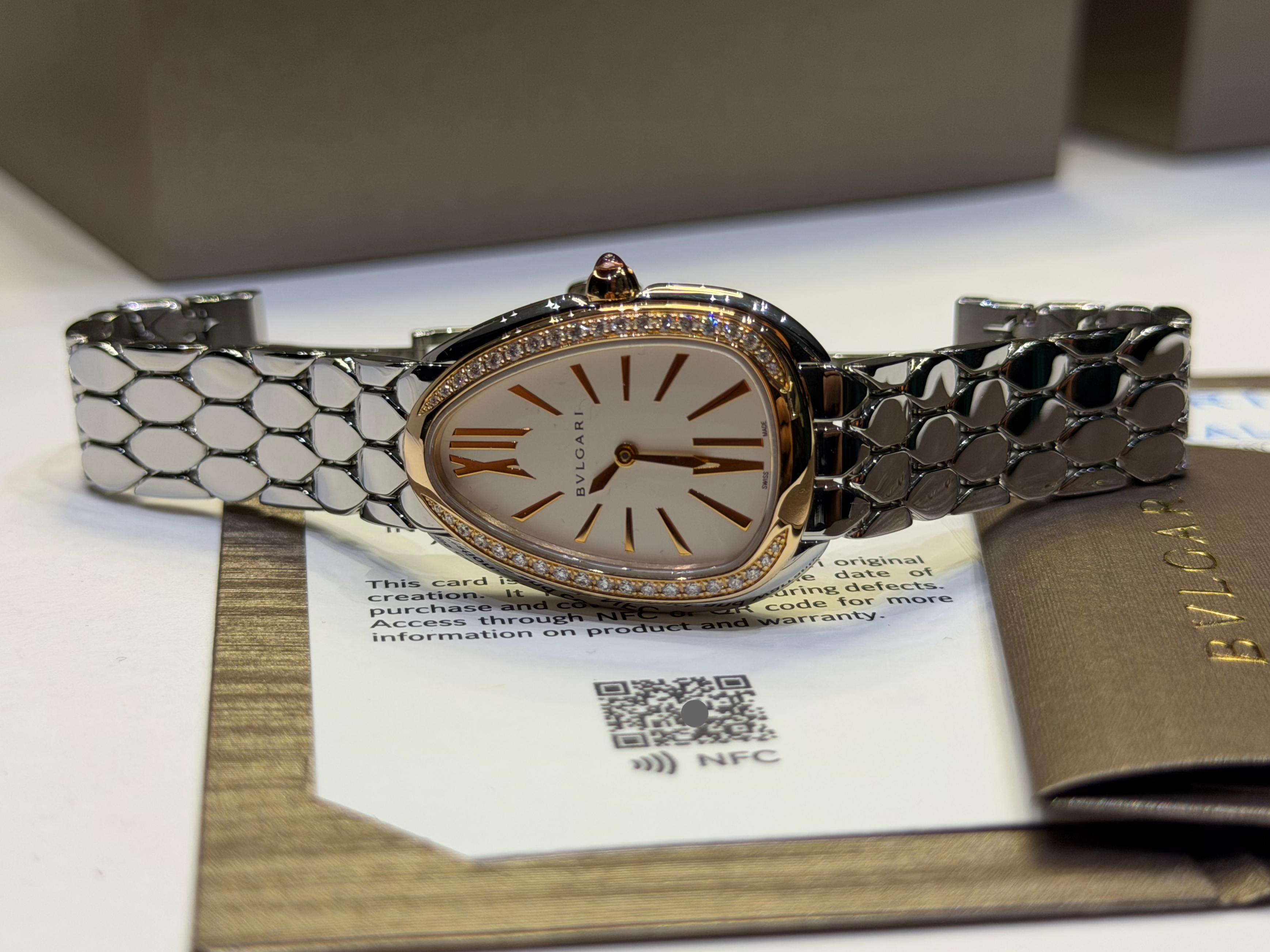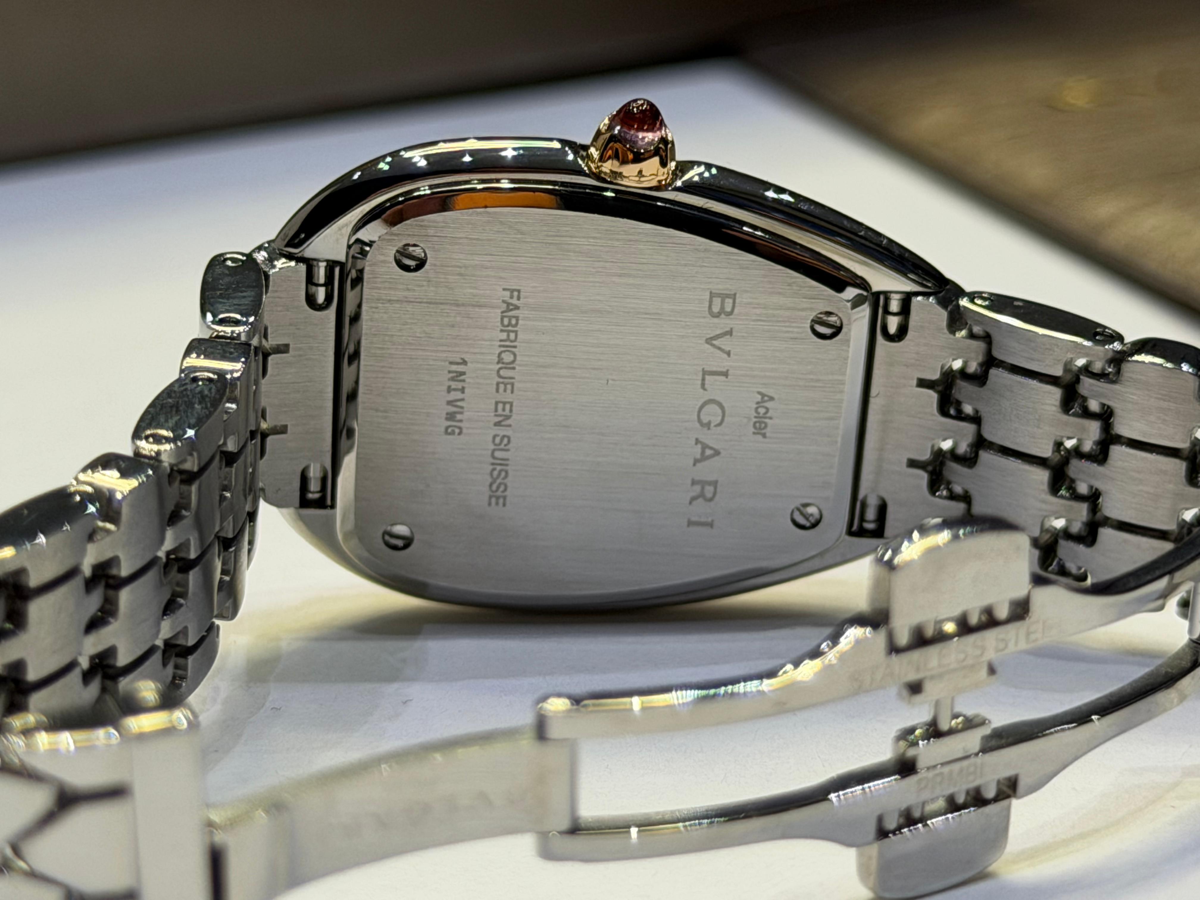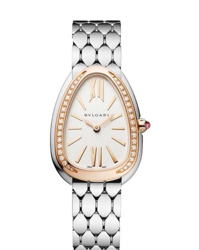 Часы Serpenti Seduttori, кварцевый механизм, корпус из нержавеющей стали, диаметр 33 мм, безель из розового золота 18-карат с бриллиантами, заводная головка из розового золота 18-карат с розовым рубеллитом огранки кабошон, серебристо-белый опаловый циферблат, браслет из нержавеющей стали с раскладывающейся застежкой.