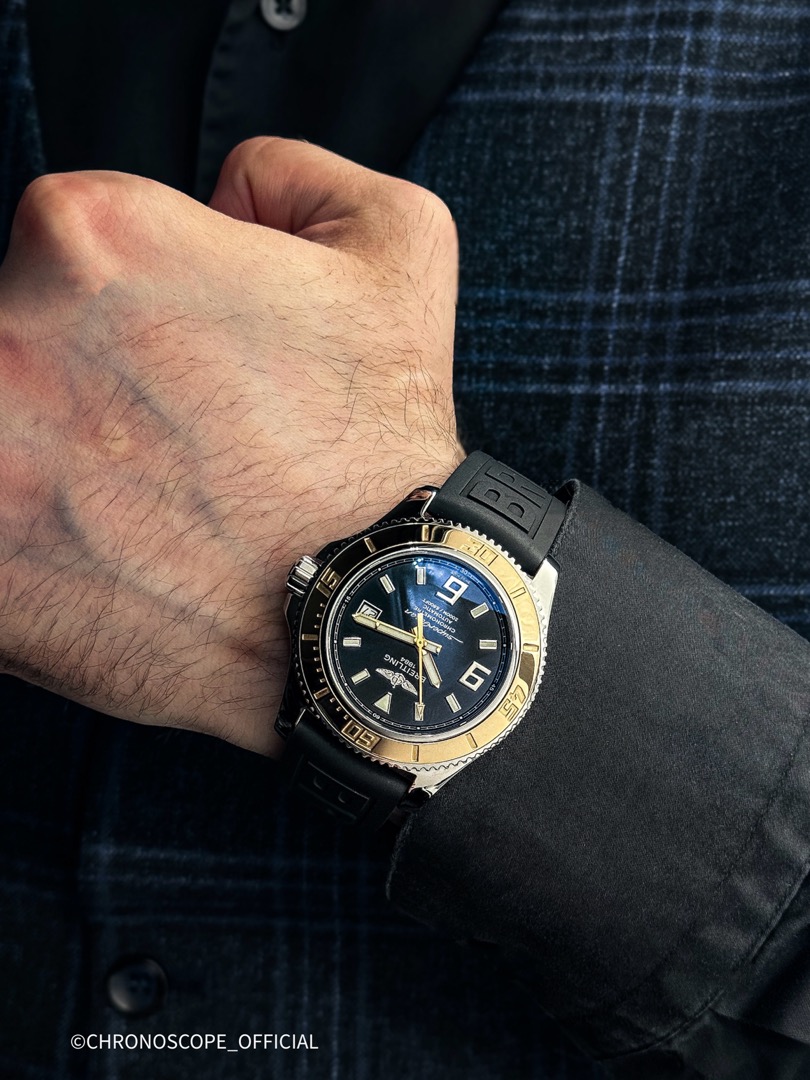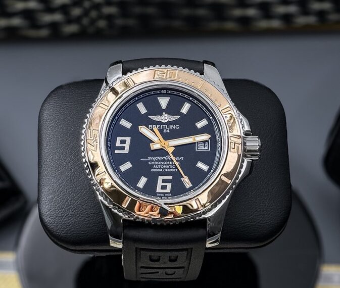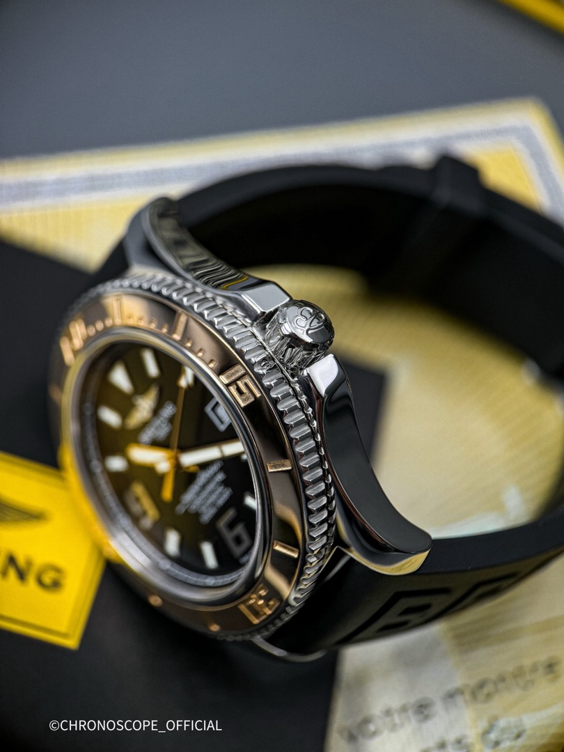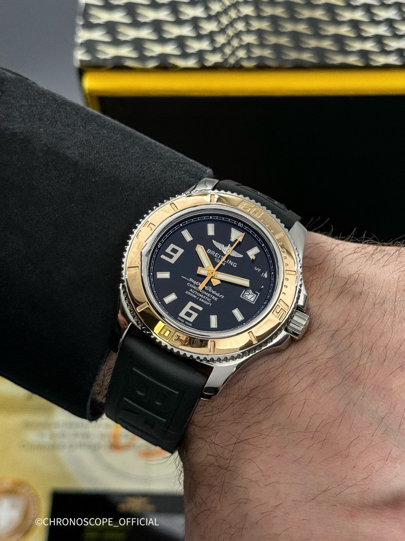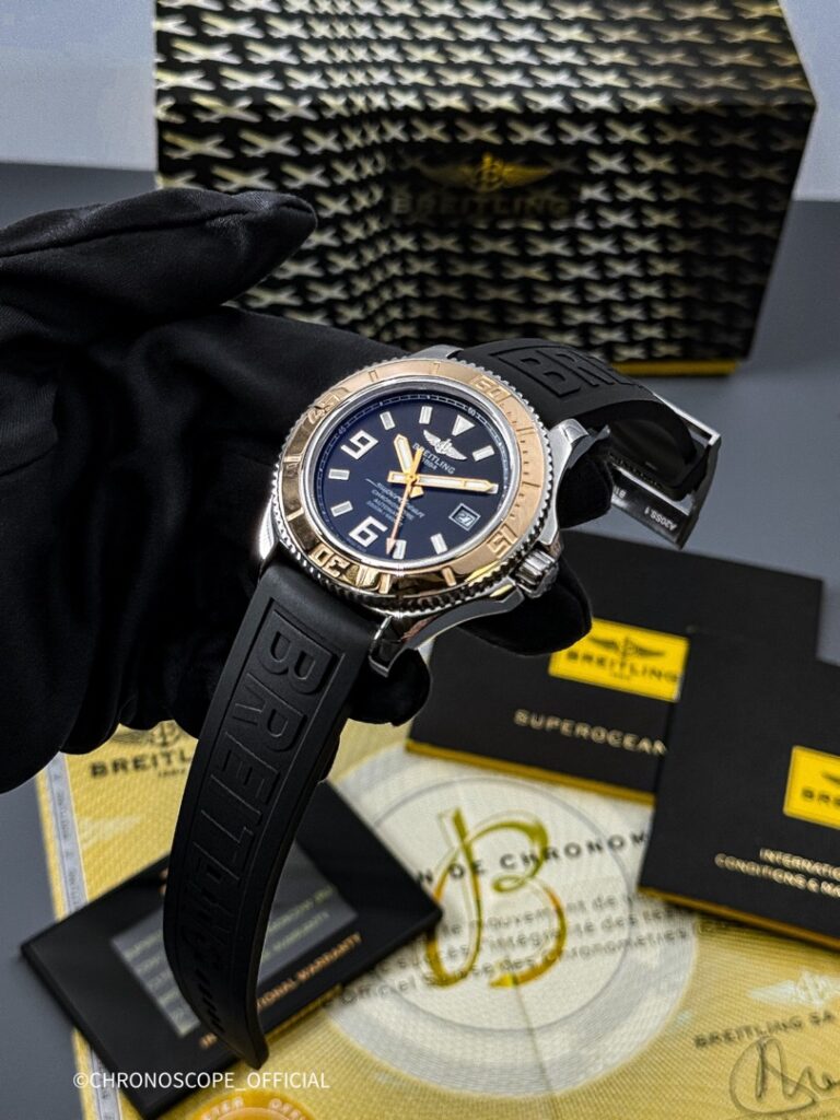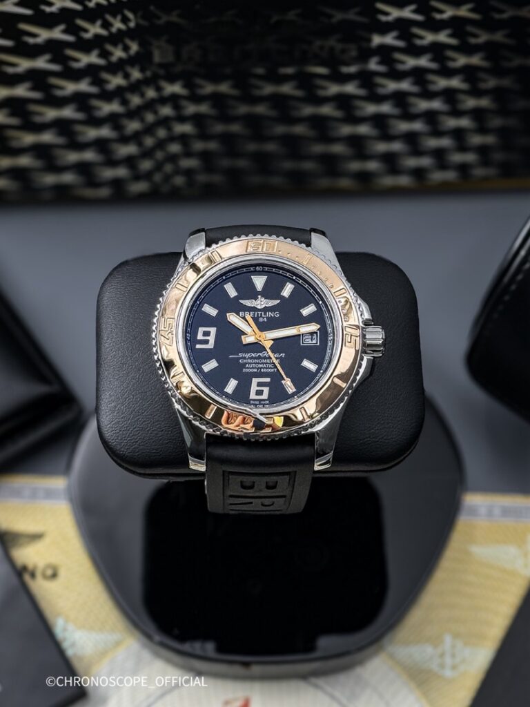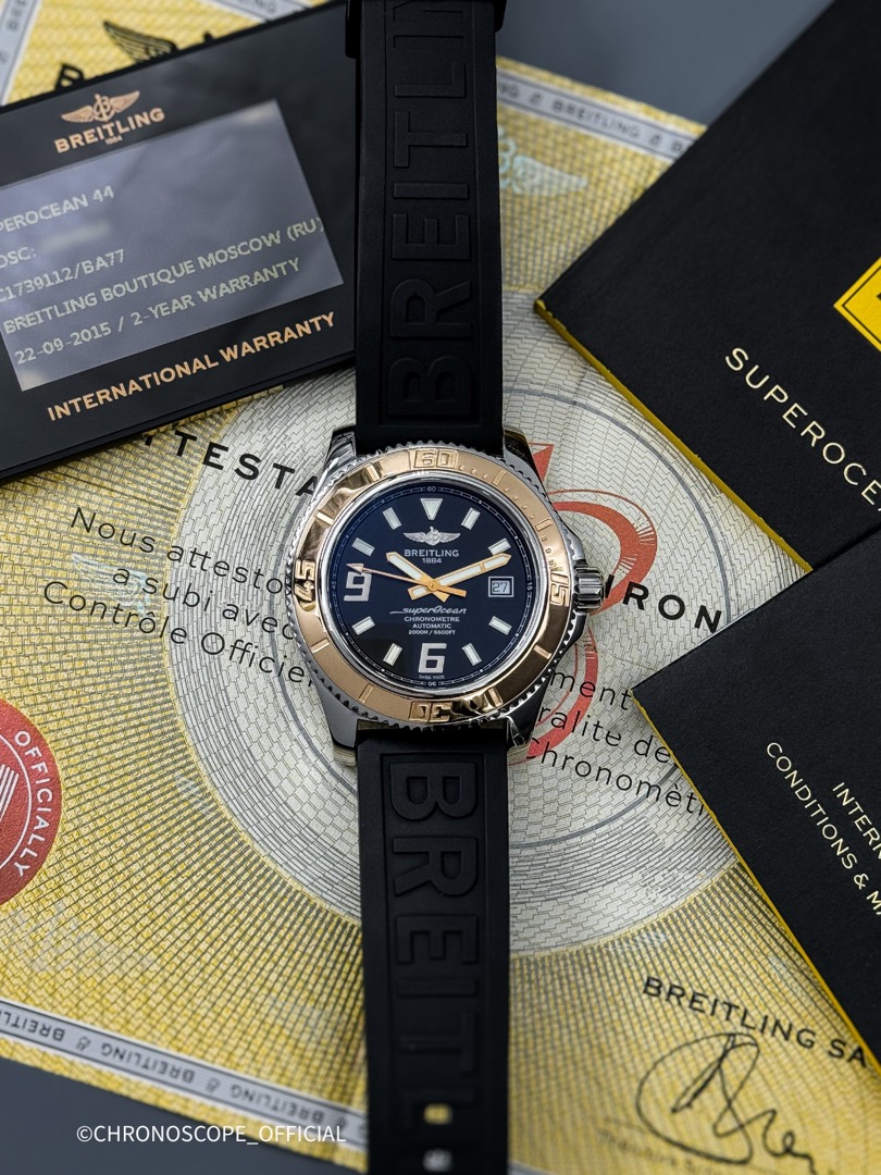Модель Superocean 44 отличается своей исключительной водонепроницаемостью до глубины 2000 метров (6600 футов)благодаря завинчивающейся головке и исключительной герметизации и слегка видоизмененным циферблатом, с нанесенными на него наклонными арабскими цифрами 6 и 9, обозначающими четверть часа, и изящным цветом, оттеняемым черным фоном. Часы оснащены механизмом Breitling 17 с автоподзаводом, сертифицированный швейцарским институтом хронометрии (COSC)