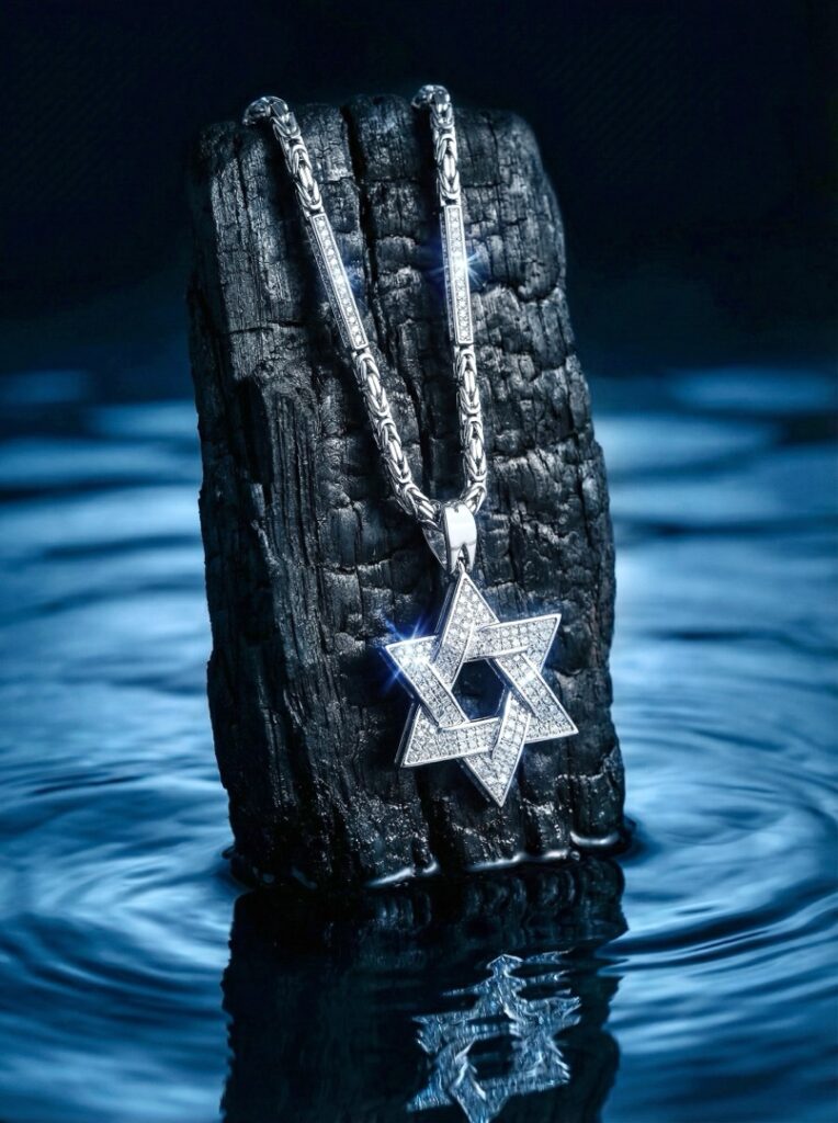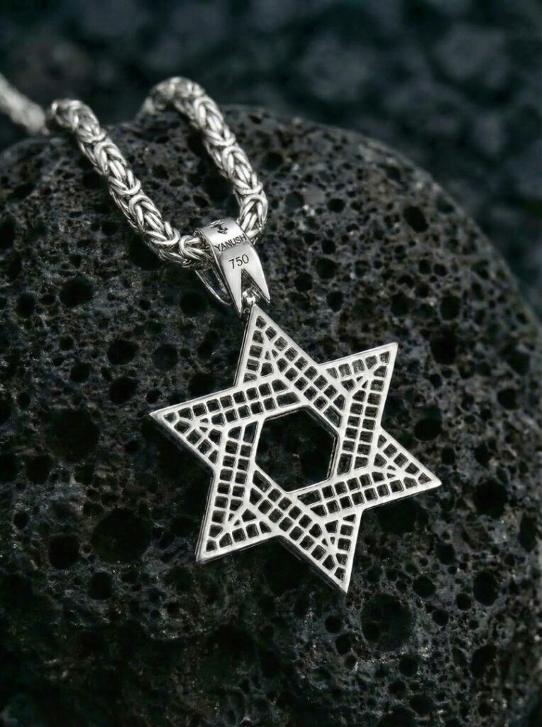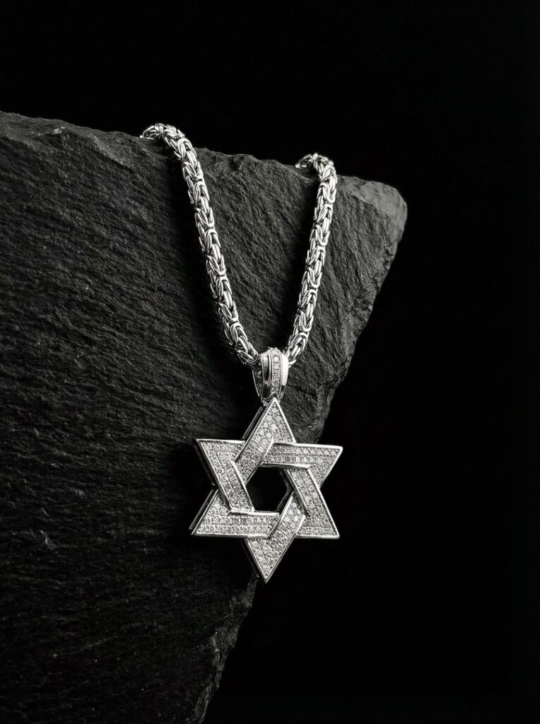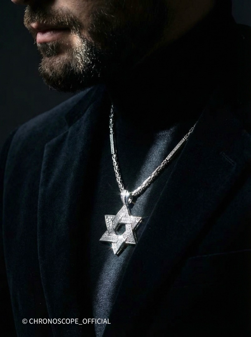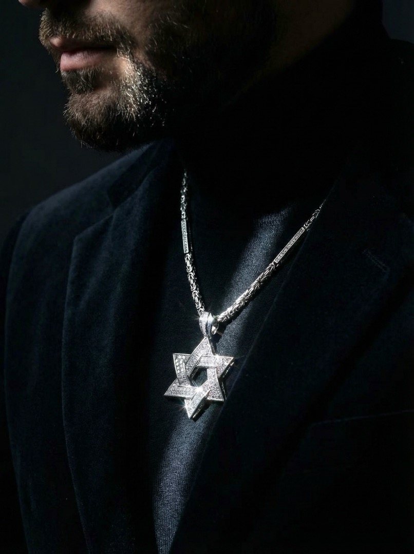 - Сердцем этого украшения является, безусловно, подвеска в форме звезды Давида, инкрустированная россыпью бриллиантов. 346 бриллиантов общим весом 6.88 карат, чистотой 3-4/3-5, сверкают и переливаются при каждом движении, притягивая взгляды и очаровывая своим блеском.
