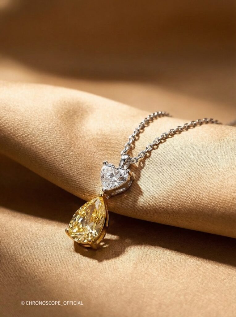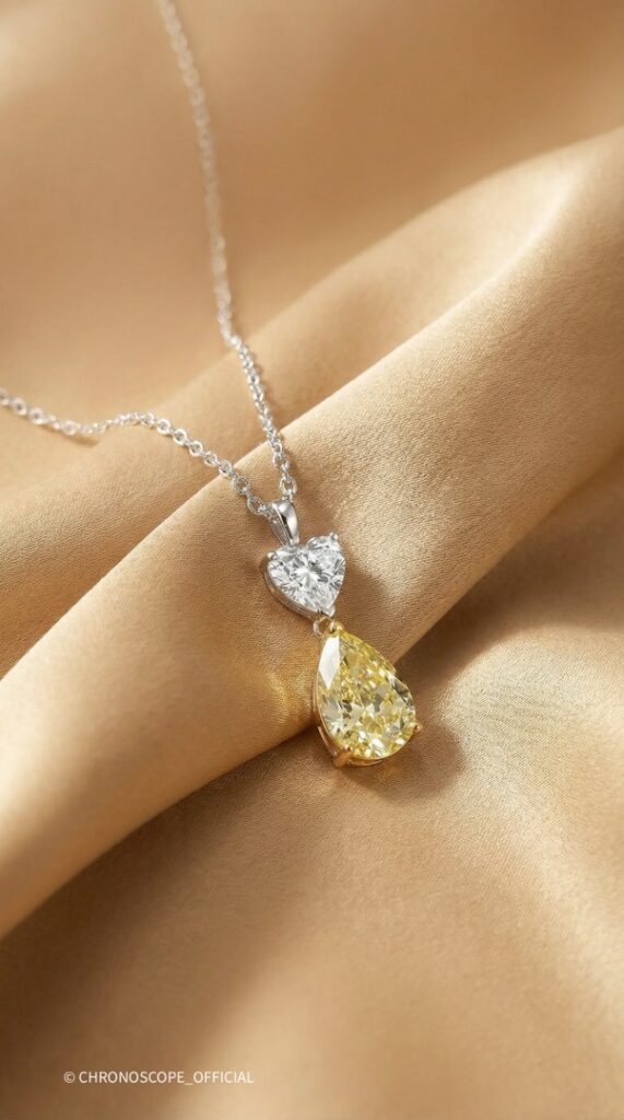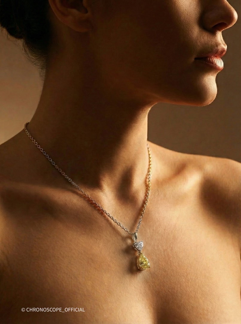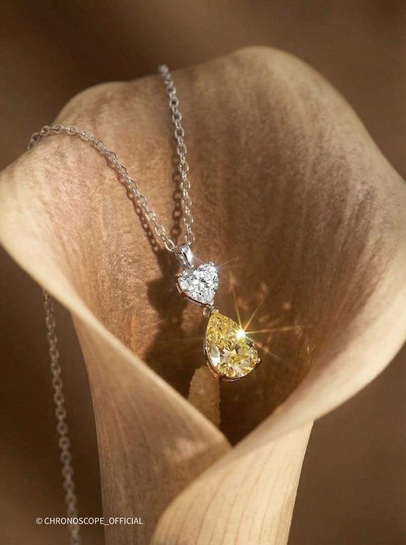 - Контрастом и дополнением служит бриллиант огранки «сердце», весом 0.50 карата, с безупречными характеристиками: цвет F и чистота VVS1. Его нежное сияние подчеркивает глубину и насыщенность желтого бриллианта