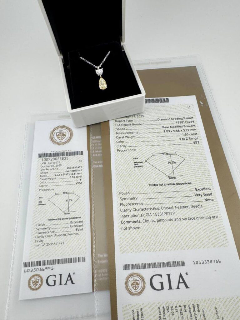 - Подлинность и исключительные характеристики бриллиантов подтверждены сертификатами GIA, что гарантирует их подлинность и высокую инвестиционную ценность.