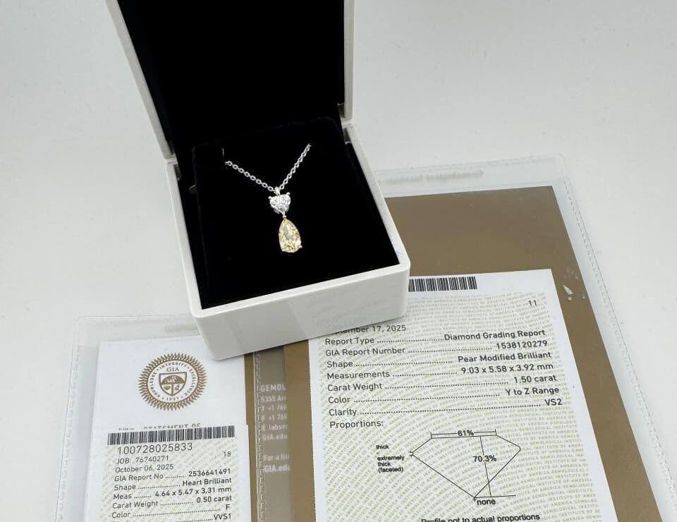 - Солнечный желтый бриллиант огранки «груша», весом 1.50 карата, в диапазоне Y to Z, подобен капле застывшего меда, излучающей тепло и свет. Его чистота VS2 гарантирует кристальную ясность и исключительную игру света, преломляющегося в гранях и создающего неповторимый блеск. Этот бриллиант – символ радости, оптимизма и жизненной энергии.