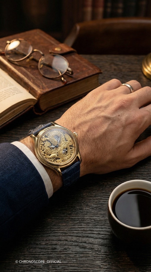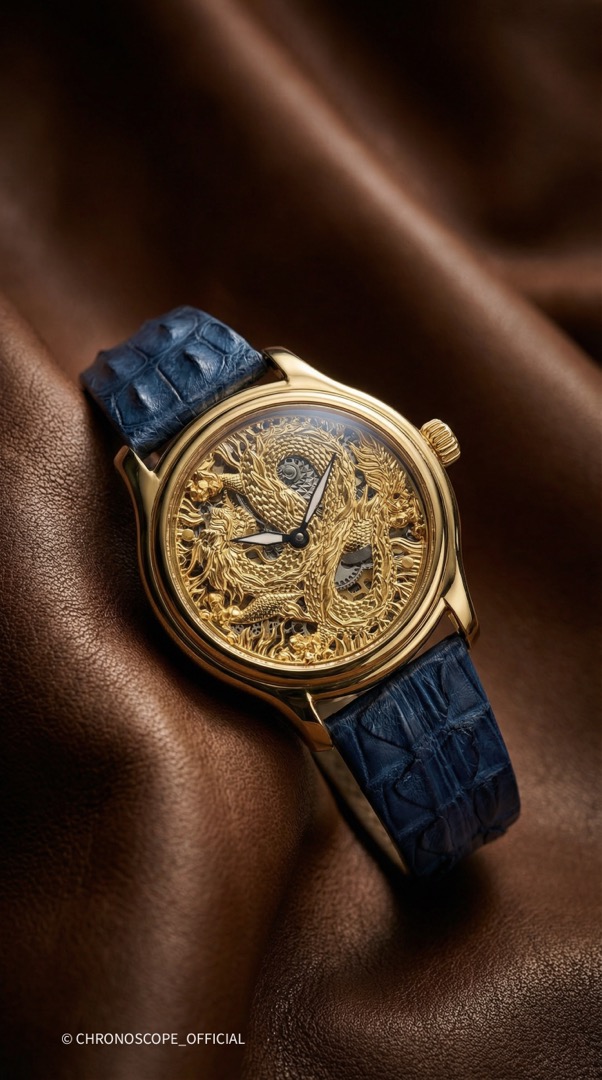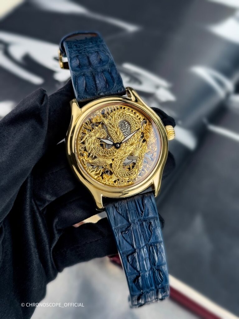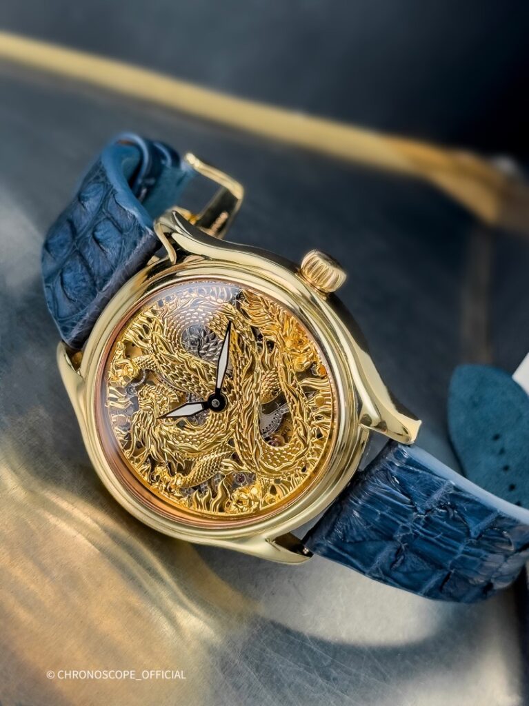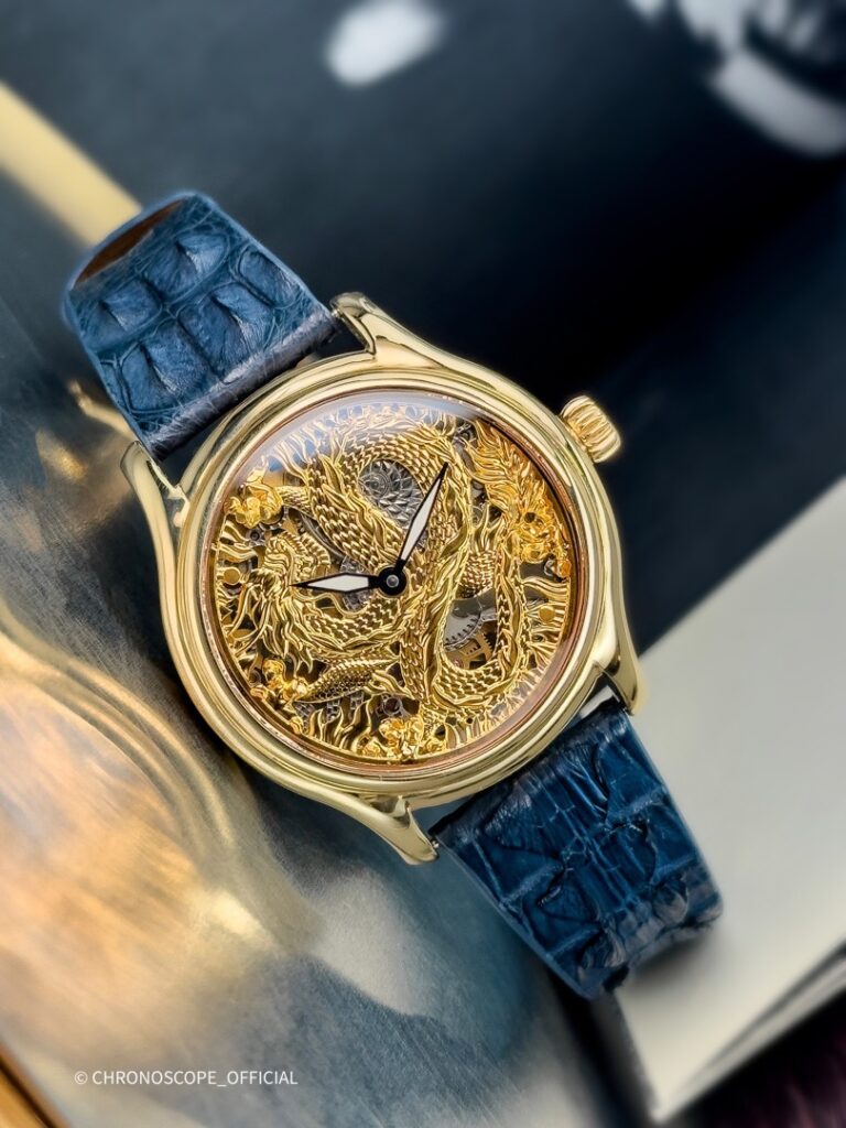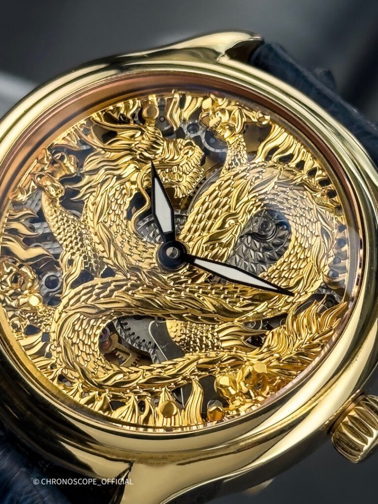 Не менее впечатляет скелетонированный циферблат с изображением дракона, где каждый элемент мифического существа — от чешуи до когтей, от клыков до гребня — выполнен с ювелирной точностью.